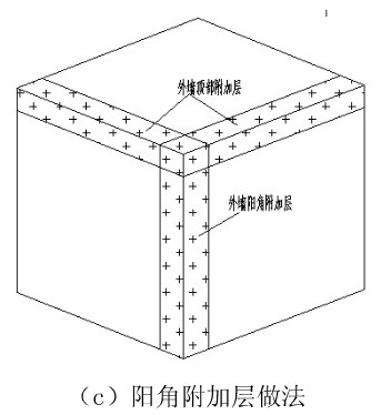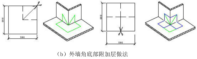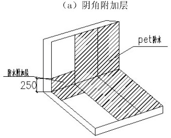 9、防水卷材密封收頭:卷材收口用金屬壓條和鋼釘固定,再用密封膏密封。卷材收口應(yīng)高出室外地坪500 mm。 (三)各節(jié)點做法 1、陰陽角附加層做法如下,附加層總寬度為500mm,每側(cè)250mm。